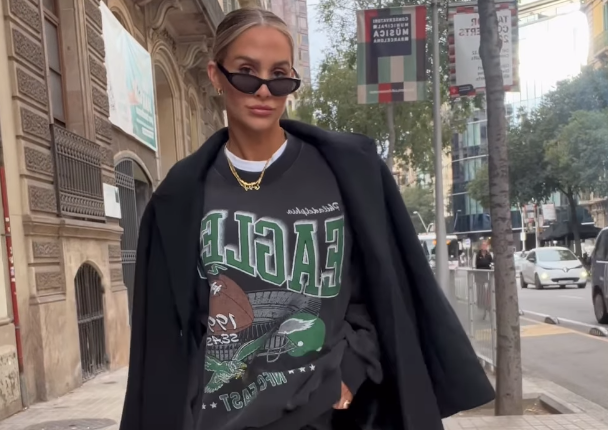 Fashion influencer Emily Shak filmed a quick fit check on the side of the pavement while out and about. She wore an oversized Philadelphia Eagles graphic crewneck sweatshirt with a pair of…