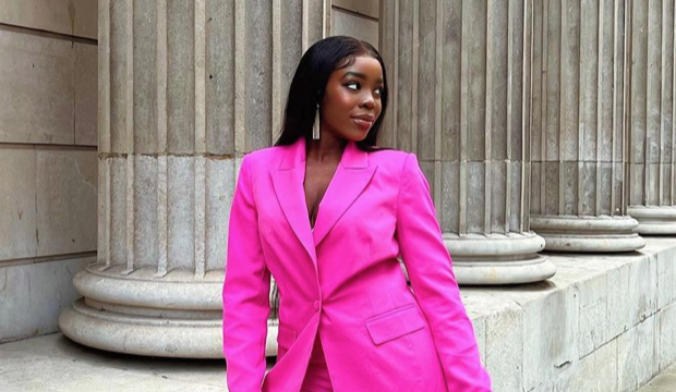 Love Islander Kaz Kamwi stopped for a few photos in front of a pillar-lined building…