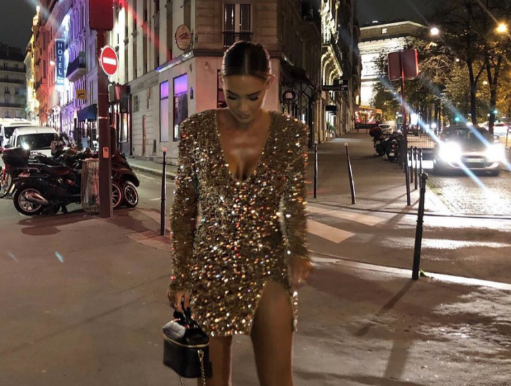 Emily Shak shined as she posed on the streets of Paris wearing a gold sequin…