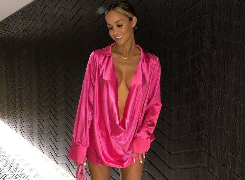 32-year-old Emily Shak wowed as she posed in a dazzling hot pink deep low cut…