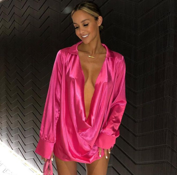 32-year-old Emily Shak wowed as she posed in a dazzling hot pink deep low cut…