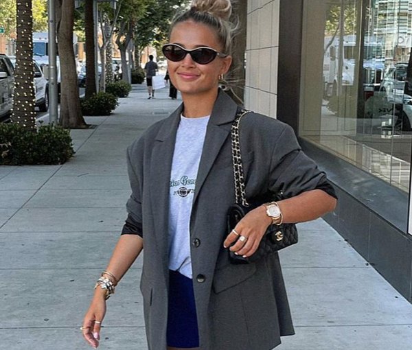 Fashion Influencer Emily Shak looked effortlessly chic as she dressed down a purple two-piece suit…